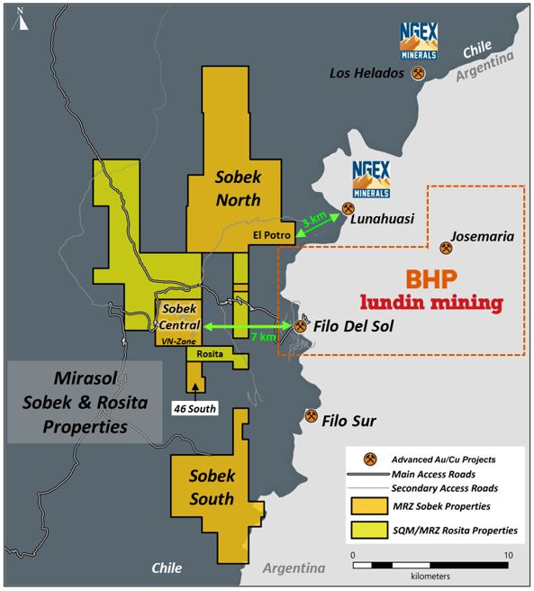 Mirasol staked the Sobek Project in 2016 based on prospective local geology and attractive structural architecture prior to the 2021 discovery of the high-grade feeder zone at the Filo del Sol gold-copper deposit and the 2023 discovery of Lunahuasi. The consolidated Sobek Project is located on the same regional N-S trending structural corridor and just 7km to the west of the Filo del Sol deposit and 3km to the southwest of NGEx Mineral’s discovery at Lunahuasi.