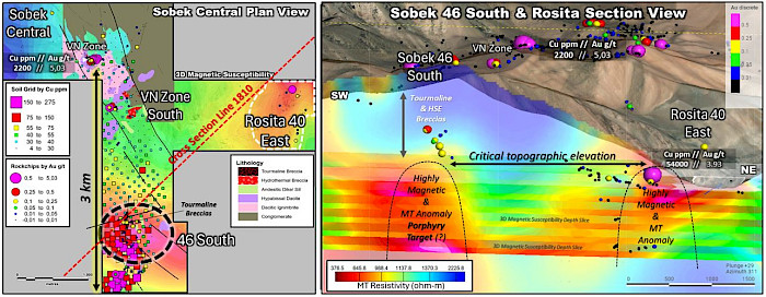 The Airborne MT data defined an underlying sharp resistivity contrast coincident with a strong cylindrical magnetic susceptibility anomaly directly below 46 South, starting at an elevation of ~4,600–4,500 masl and extending to depth. This anomaly aligns with the strongest part of the soil geochemical footprint. Comparable MT conductors in the Vicuña District have been reported at NGEX`s Lunahuasi discovery, where porphyry-related mineralization begins at ~4,600 masl and strengthens between ~3,800–3,900 masl and also at Mogotes Filo Sur project (at ~4,500 masl, interpreted as a porphyry target). The alignment in elevation and style suggests that the MT anomaly at 46 South may represent the upper levels of a porphyry system.