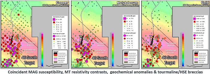 The integration of airborne magnetics and MT, ground IP resistivity and chargeability, structural mapping and geochemistry establishes 46 South as a very compelling undrilled target within the Vicuña District. A first-pass drill hole is being designed to test the overlapping soil anomaly with the underlying resistive and chargeable bodies while also penetrating the deeper MT response interpreted as the possible roof zone of a porphyry system. Drill positioning is planned to be slightly offset from the chargeability center to maximize the chances of intersecting mineralization in both the near surface and deeper targets. We expect to complete the Deep Vector IP and MT geophysical survey by mid-October and anticipate launching the 2025 drill program in early November.