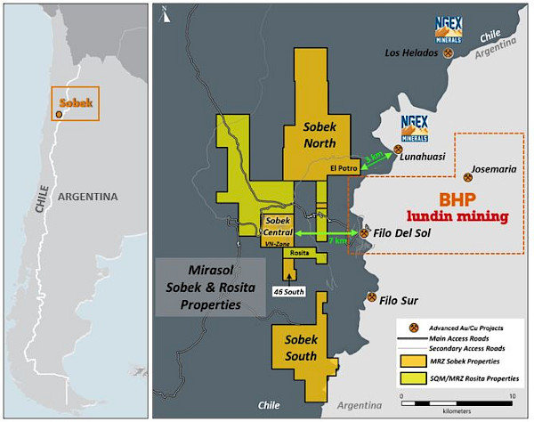 Mirasol staked the Sobek Project in 2016 based on prospective local geology and attractive structural architecture prior to the 2021 discovery of the high-grade feeder zone at the Filo del Sol gold-copper deposit and the 2023 discovery of Lunahuasi. The consolidated Sobek Project is located on the same regional N-S trending structural corridor and just 7km to the west of the Filo del Sol deposit and 3km to the southwest of NGEx Mineral’s discovery at Lunahuasi.