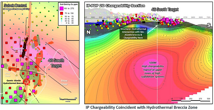 Located at the south end of Sobek Central, the 46 South target resides on the southern margin of a district-scale magnetic high where both the airborne MT and magnetics surveys outlined distinct cylindrical anomalies. The grid-based soil survey outlined a coincident prominent, large and coherent copper-gold-moly geochemical anomaly on surface that directly overlays IP-PDP resistivity and chargeability responses from IP ground geophysics surveys completed late last season. Structurally controlled tourmaline breccias and hydrothermal breccias were also identified while prospecting and mapping in the target area (news release dated Sep 16, 2025).